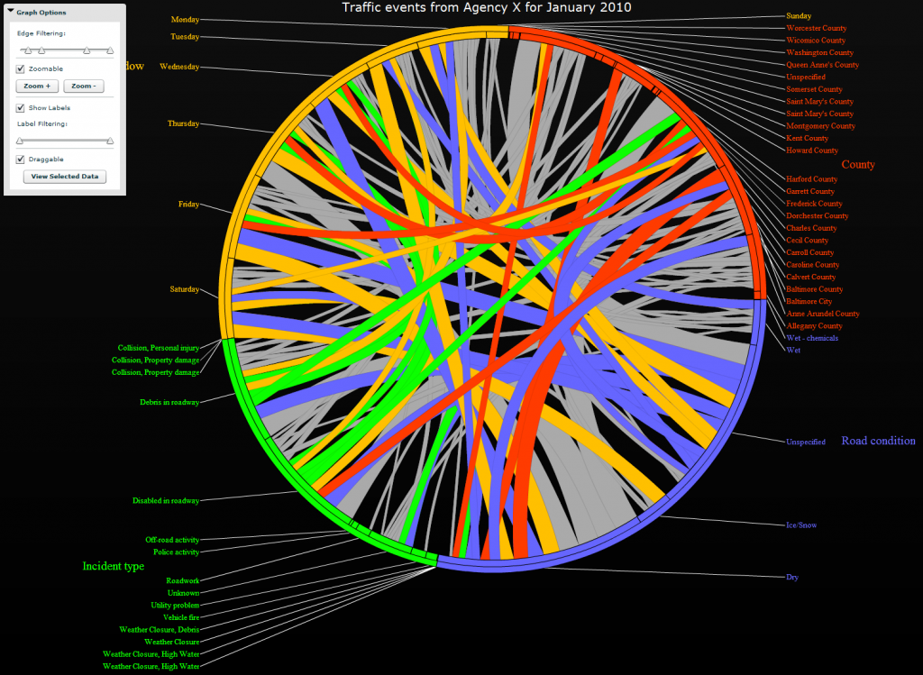 When dealing with data sets containing hundreds of variables, it is often extremely difficult, if not impossible, to quickly discover important and significant relationships that exist among the various data points. The Arc Chart, an interactive, web-based circular dependency graph, was developed to give analysts the ability to visually identify these dependencies and links between any categorical, temporal, or spatial variables in a given data set. The figures below highlight some of the features found in the Arc Chart.
